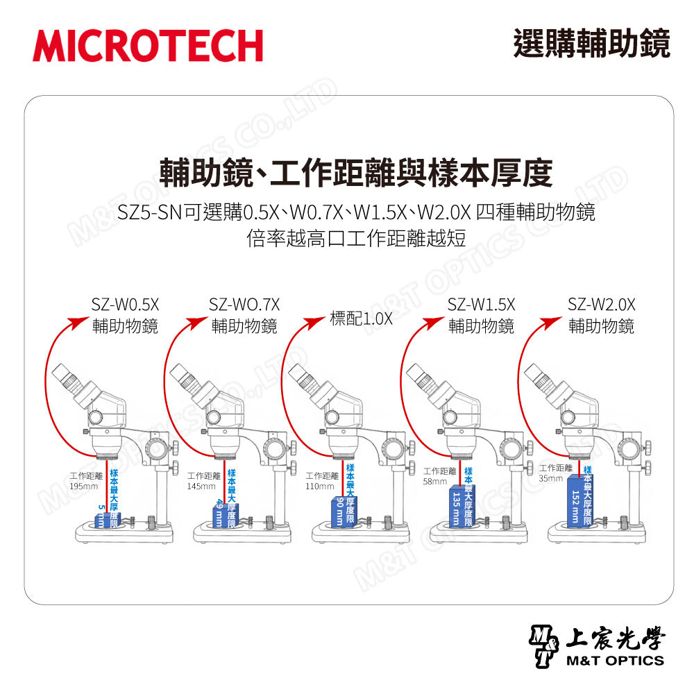 - Auxiliary objective lens to increase working distance (0.7X/WD=145mm, 0.5X/WD=195mm, 0.37X/WD=275mm)