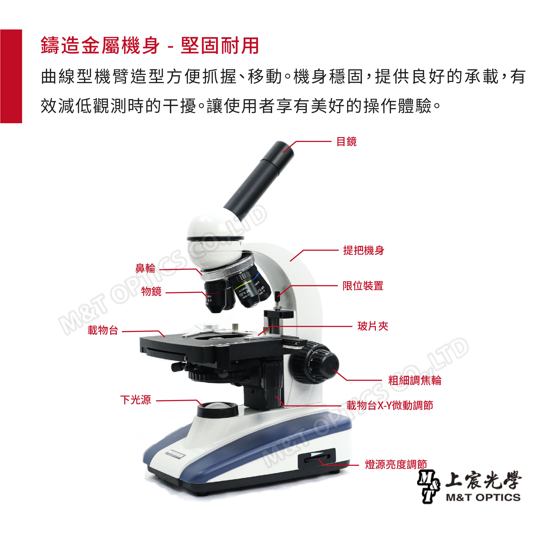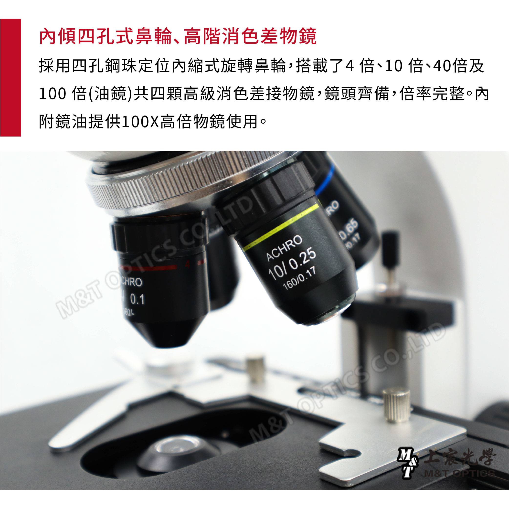 | 物鏡 | 4X、10X、40X(伸縮型)、100X(oil油鏡伸縮型) |