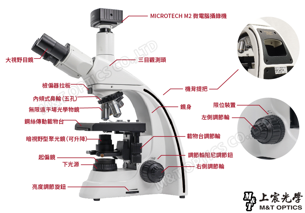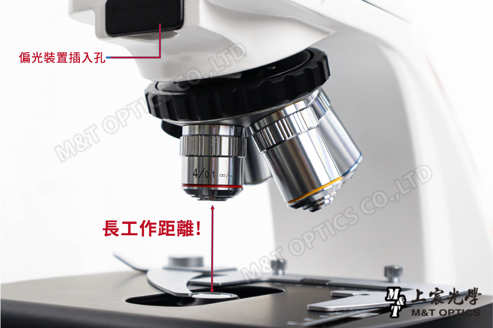| 粗微動同軸調焦 | 附鎖緊和限位裝置,微動格值2μm 五孔內縮式鼻輪轉換器,內附簡易偏光檢偏鏡。 |